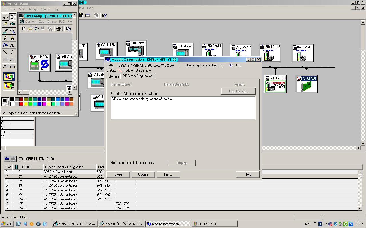 公司一臺設(shè)備電腦主板壞了,換了一臺電腦,但是無法打開軟件,報錯是界面無法打開。電腦上裝了一個CP5614的卡,DP地址為70。監(jiān)控PLC發(fā)現(xiàn)如下情況,電腦端SET PG/PC試著選了幾個接入方式好像也不行。哪位大大幫忙分析一下,謝謝了。
