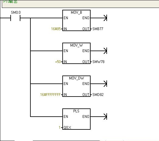 MOV 16#85    SMB77  設定PTO輸出、單段、時基為1微秒