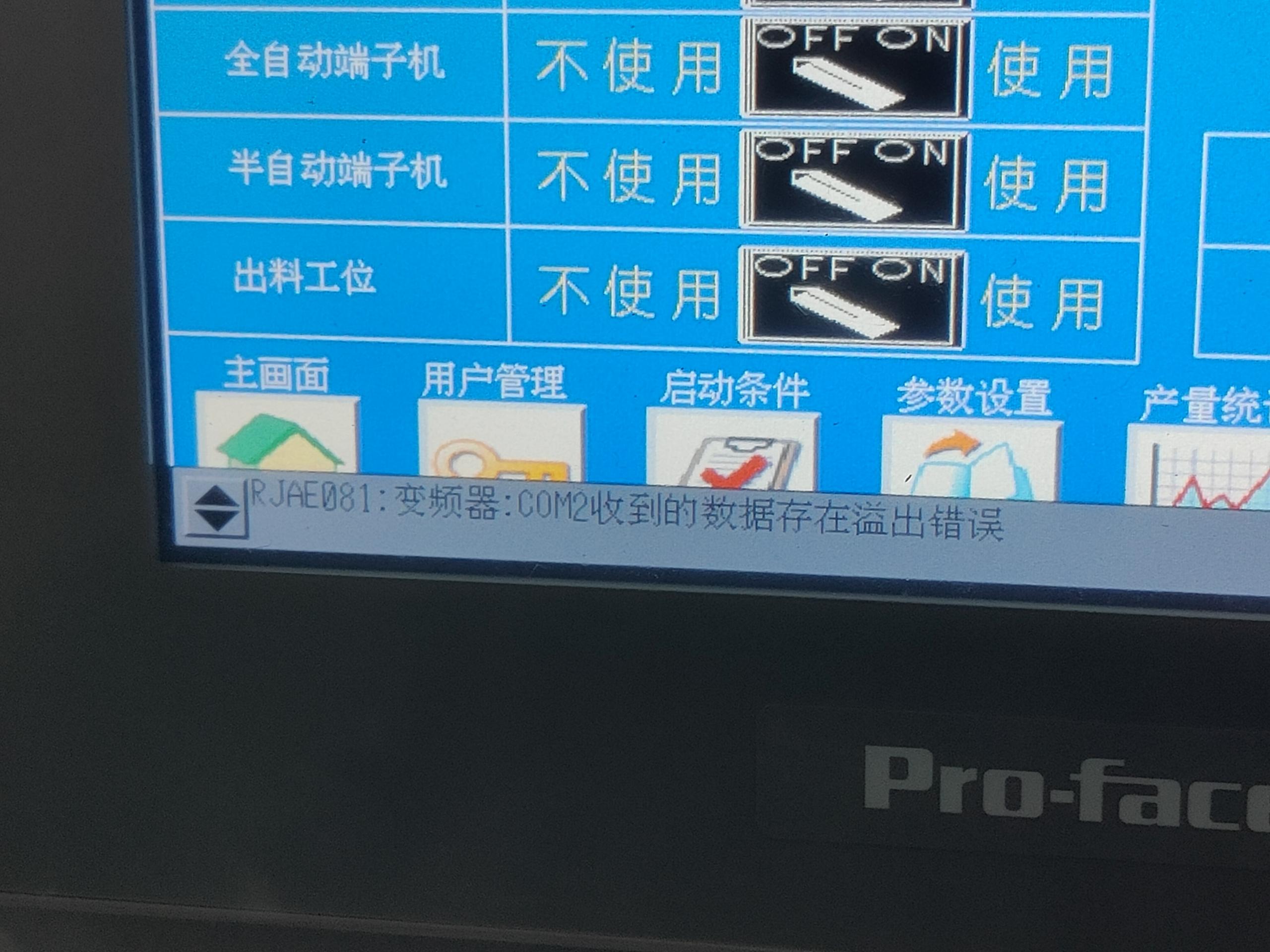 現(xiàn)在proface的觸摸屏跟歐姆龍變頻器串口通信,當(dāng)前狀態(tài)是可以通過觸摸屏修改變頻器頻率,但是每次數(shù)據(jù)傳輸成功都會有報警,如圖所示,com2收到的數(shù)據(jù)存在溢出錯誤,和com2收到的數(shù)據(jù)存在奇偶校驗錯誤,這個報警不太明白怎么回事,我不需要知道變頻器接到信號后,反饋的內(nèi)容,觸摸屏也沒有設(shè)置接收,只有個賦值到變頻器地址的腳本。