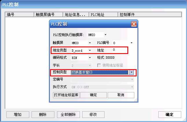 然后再設置PLC控制來切換基本窗口,如D0,地址為D_WORD0,控制類型為切換基本窗口。