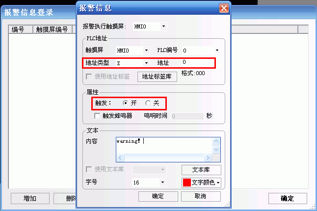 首先建立報警信息登陸,地址為X0,你可以選擇為on或為off時觸發。