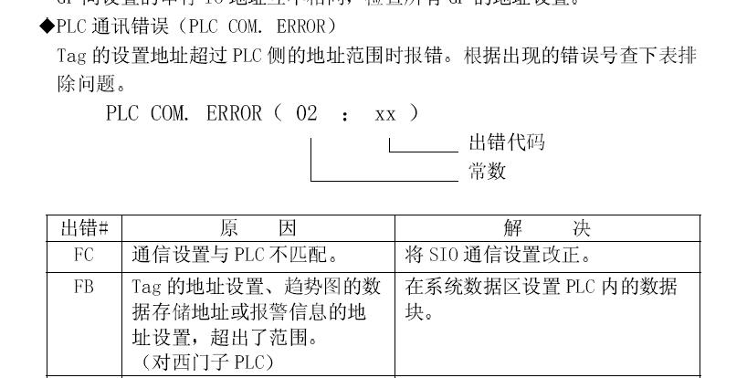 引用引用樓主xiaxiuzhan于2009-08-03 21:30發表的 GP2500程序上載問題!! : GP2500與AB SLC5/05通過交換機連接 我先上載程序到筆記本,然后在下載到Gp ,結果就出現問題:PLC COM ERR 02:FB 但是數據顯示都沒有問題 不知道問題出在何處