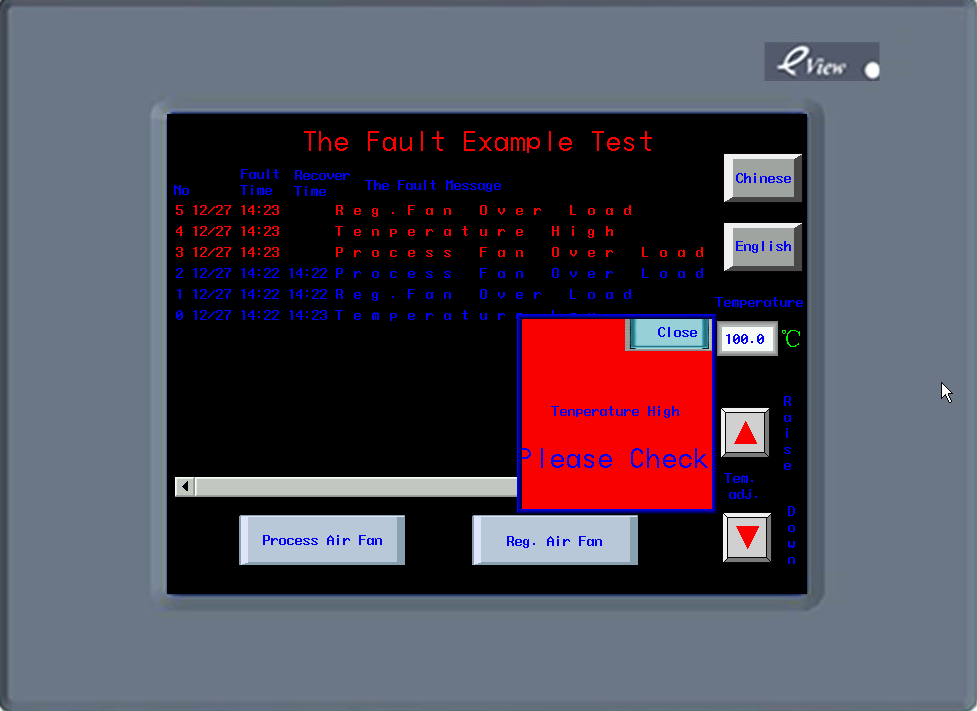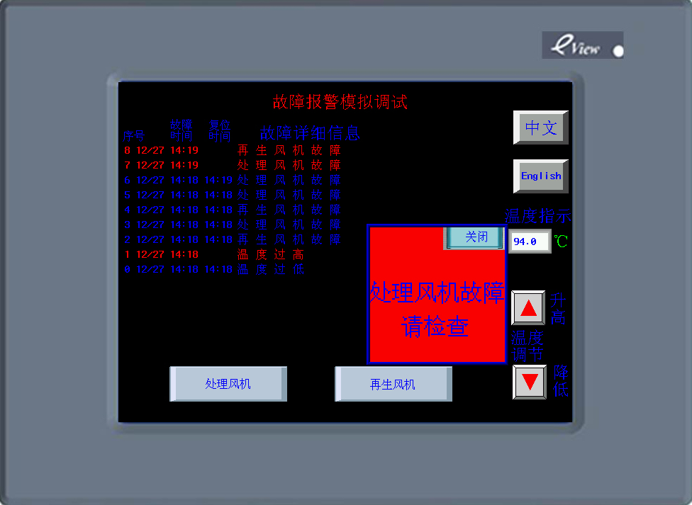 最近做了個故障報警模擬調試界面,是用eview的MT5400T做的,拿來和大家分享一下,不足之處請指正。
