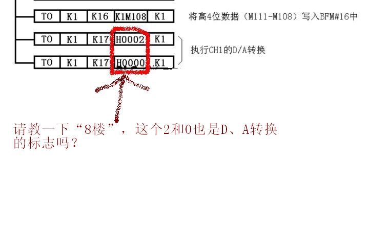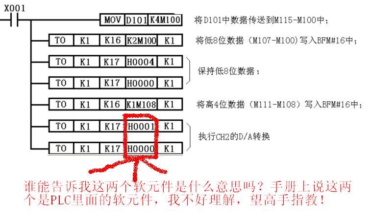 將十六進制數1(0)寫入1#模塊的BFM17中,這個意思我懂。3樓的解釋結合我剛才的這個實例我還是有點模糊,是把H0001(0)轉換為模擬量輸出嗎?好象也不是。能再具體點嗎?謝謝!