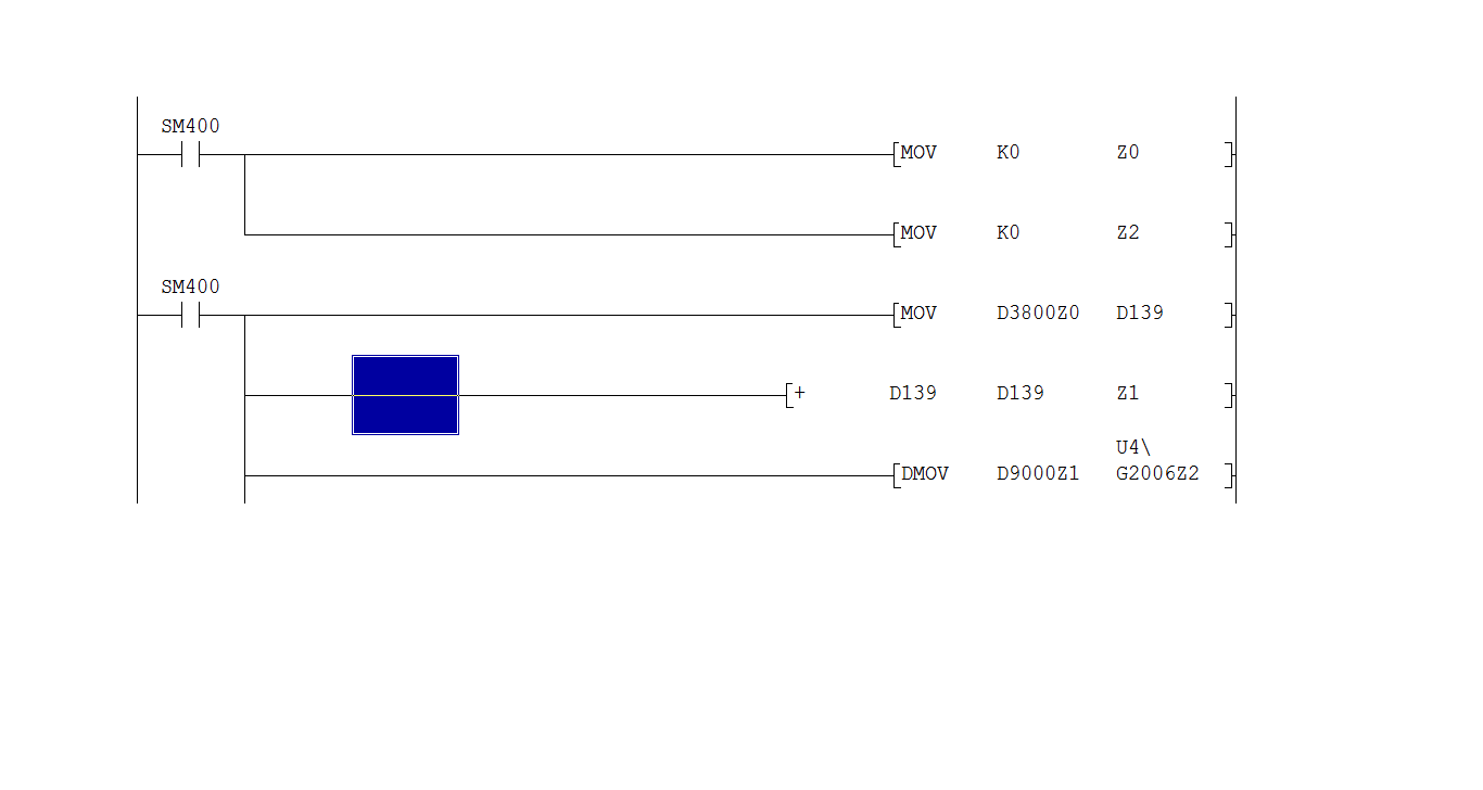 [MOV K0 Z0],[MOV K0 Z2]傳送0至Z0和Z2,用SM400作為條件,則是執(zhí)續(xù)傳送。