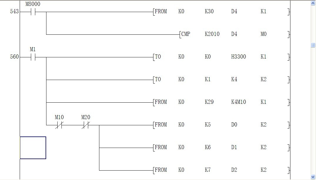 初學者,見笑,我想采集0號位置的外接模塊FX2N-4AD的信號,4個通道,1和2通道為電壓0-10V,3和4通道為-20mA到20mA電流信號,1通道采集的數據存放到D1210,2通道采集的數據存放到D1211,3通道采集的數據存放到D1000,4通道采集的數據存放到D1002,請問程序該怎么編? |