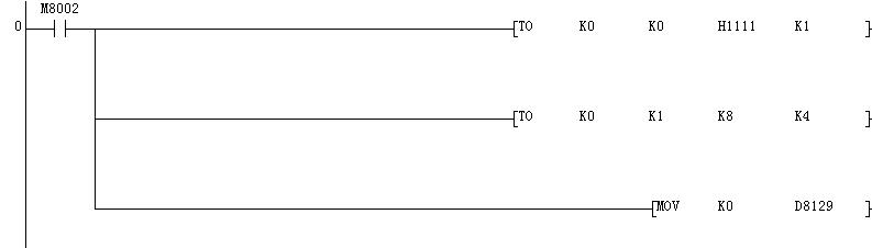 開機時初始設定,將H1111傳送至第一個模塊的BFM 0 通道,將K8傳送至第一個模塊的BFM 1、2、3、4 通道,D8129為超時判斷時間設定。具體BFM通道意義參考相應的模塊手冊。