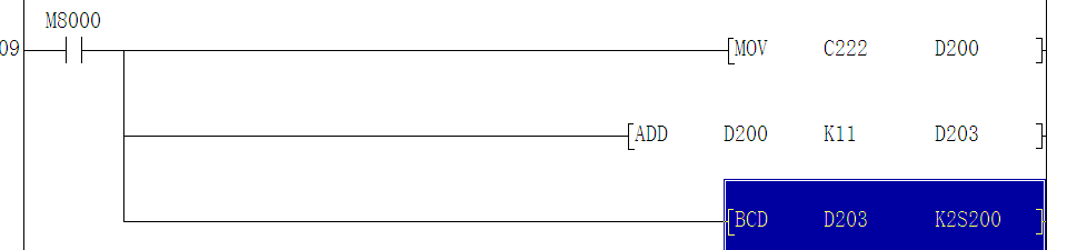 D200里的數字是C222計數器傳送來的數值。42是C222的當前計數值。D203的數值=D200(42)+K11=53。