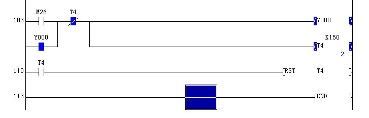 Y0為ON時,T4循環計時的動作是正常的,因為T4計時到達設定值后變成ON,但程序執行到110行就會將其復位掉又變成OFF,這樣再掃描到103行時它的狀態還是OFF的,無法將Y0斷開。所以Y0持續為on并且T4重新計時。