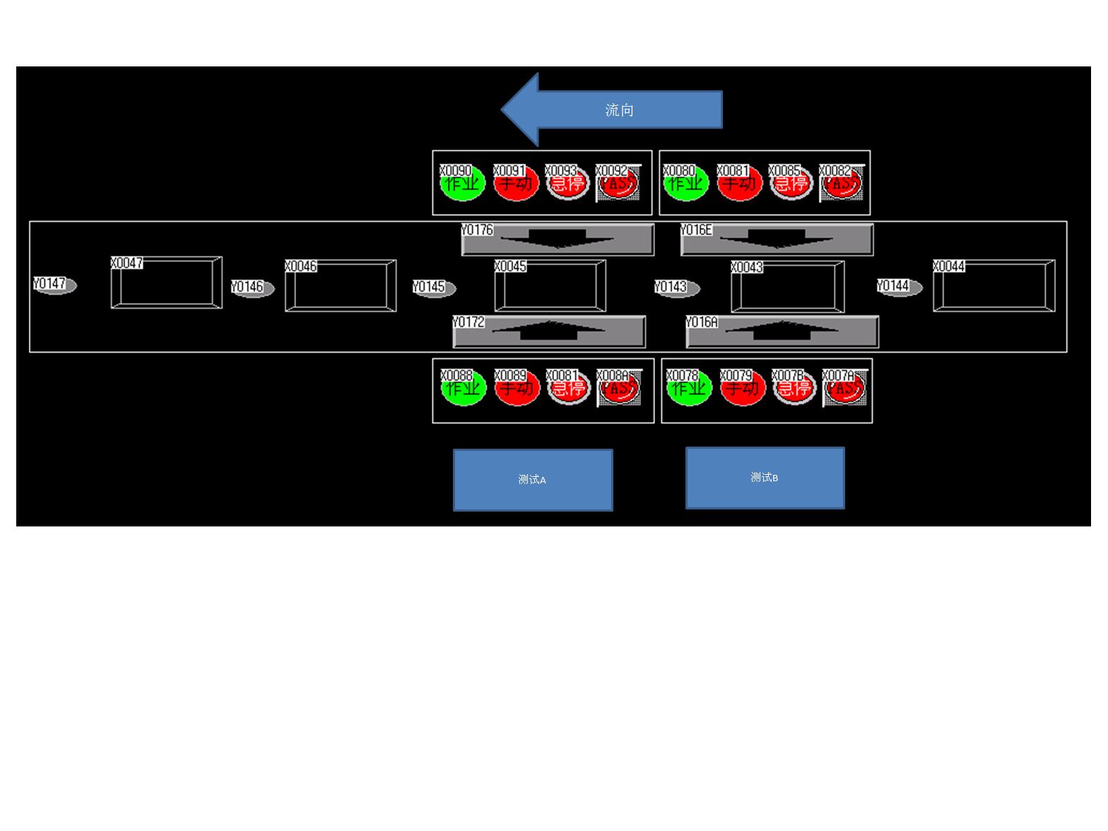 每個阻擋器前面均有一個行程開關,測試站A與B的兩面各有一個PC測試,通過棧板到位測試。PC發送PLC一個PASS信號。