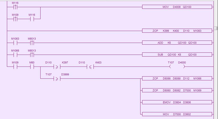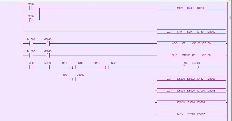 這三段程序都是同一程序的一部分且能正常運行,Qd100是變頻器,D110是壓力傳感器,D3504和D7000分別是瞬時流量和脈沖;問題是三段程序都把流量和脈沖mov到同一個地址D3506和D3502上,而在力控上顯示時又分別在不同的位置,求教是怎樣做到的?