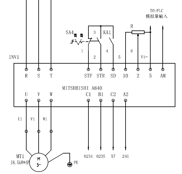 A840變頻器的AM模擬量輸出,直接連到FX5U自帶的模擬量輸入,用來檢測(cè)變頻器輸出頻率。