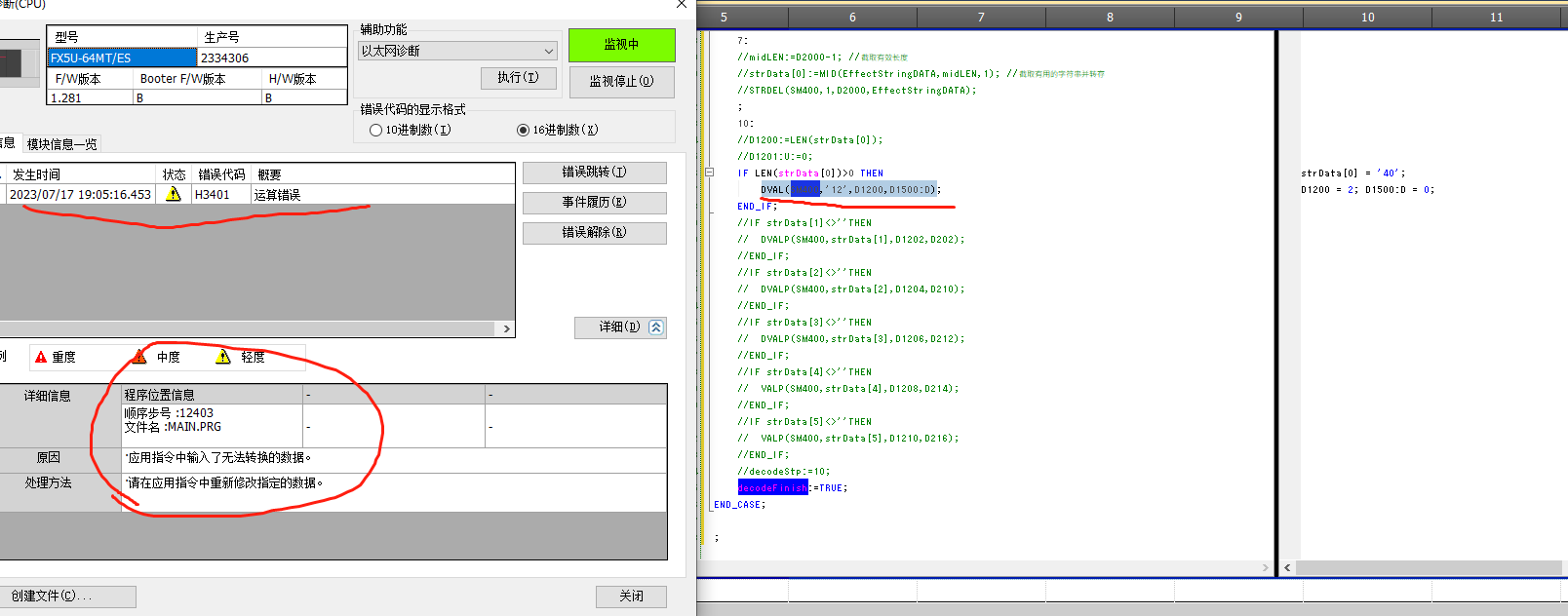 字符串搞出來了,先用搜索INSTR,再用截取MID,最后用刪除STRDEL,   但現(xiàn)在遇到個(gè)問題,字符提取出來后,用DVAL指令CPU會(huì)報(bào)錯(cuò),假如解析出來的字符是“123” , DVAL(SM400,'123',D1200,D1500:D);就報(bào)錯(cuò)了,但轉(zhuǎn)出來的數(shù)據(jù)又是對(duì)的,什么原因呢,  |