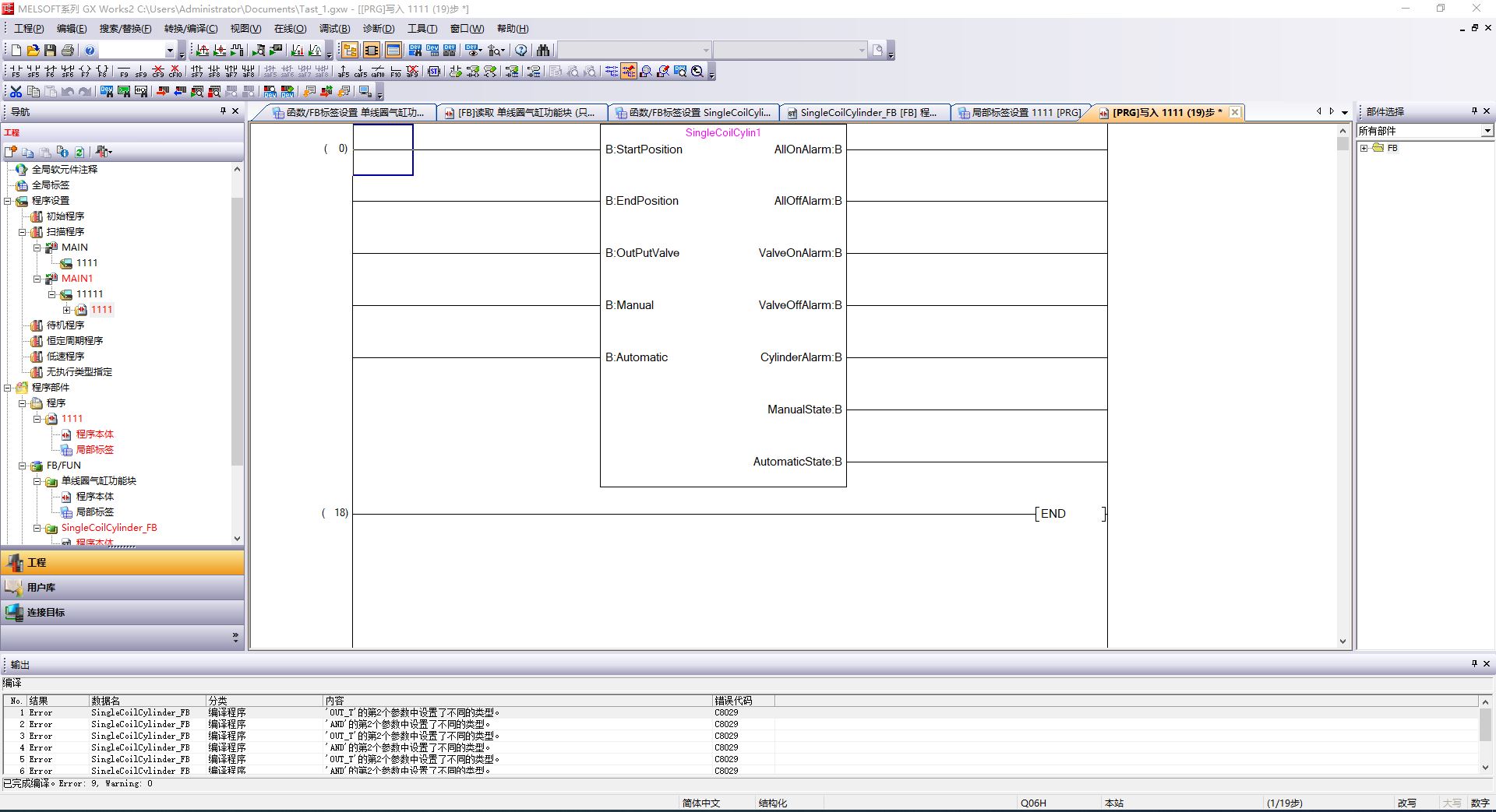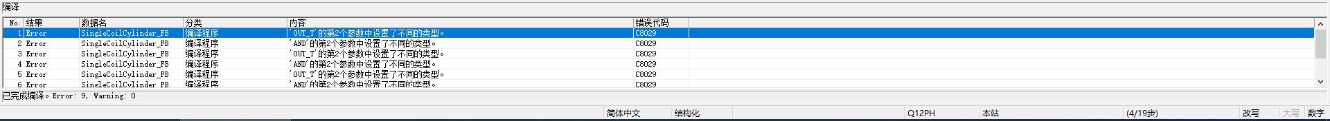 (*氣缸傳感器全亮延時=氣缸原點傳感器亮+氣缸終點傳感器亮*)OUT_T(StartPosition AND EndPosition,AllOnTime,30);(*氣缸傳感器全亮警報輸出*)AllOnAlarm:=StartPosition AND EndPosition AND AllOnTime;(*氣缸傳感器全滅延時=氣缸原點傳感器滅+氣缸終點傳感器滅*)OUT_T(NOT StartPosition AND NOT EndPosition,AllOffTime,30);(*氣缸傳感器全滅警報輸出*)AllOffAlarm:=NOT StartPosition AND NOT EndPosition AND AllOffTime;(*輸出電磁閥線圈通電延時=氣缸原點傳感器亮+電池閥線圈通電*)OUT_T(StartPosition AND OutPutValve,ValveOnTime,30);(*電磁閥線圈通電異常或原點異常警報輸出*)ValveOnAlarm:=StartPosition AND OutPutValve AND ValveOnTime;(*輸出電磁閥線圈斷電延時=氣缸終點傳感器亮+電池閥線圈斷電*)OUT_T(EndPosition AND NOT OutPutValve,ValveOffTime,30);(*電磁閥線圈斷電異常或終點異常警報輸出*)ValveOffAlarm:=EndPosition AND NOT OutPutValve AND ValveOffTime;(*氣缸異常警報輸出*)CylinderAlarm:=AllOnAlarm OR AllOffAlarm OR ValveOnAlarm OR ValveOffAlarm;(*手動狀態*)                                                   (*自動狀態*)ManualState:=Manual AND NOT Automatic;AutomaticState:=Automatic AND NOT Manual;