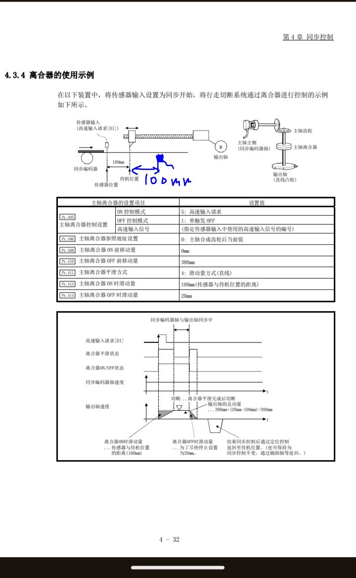 pr441凸輪行程量、先設置為的100mm(同步傳感器安裝于切刀下游的距離)+主軸電機(或皮帶編碼器)轉1圈時的皮帶移動量。