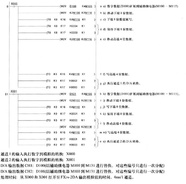 我有一設(shè)備用的是三菱Fx2-32mr 的PLC帶一Fx-2DA的擴(kuò)展模塊,擴(kuò)展模塊輸出兩路-10~+10的直流電,通訊端口與一操作介面相連,這種情況下用電腦怎么在線觀察,不知道正負(fù)10V是怎么設(shè)定的,且程序里面有一些看不懂請(qǐng)大家指點(diǎn)下:
