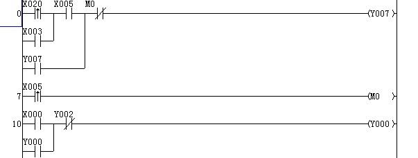 1.    按下X020或X003,Y007輸出并自鎖,按下X005后一旦松開,M0輸出1個掃描周期,Y007被斷開。