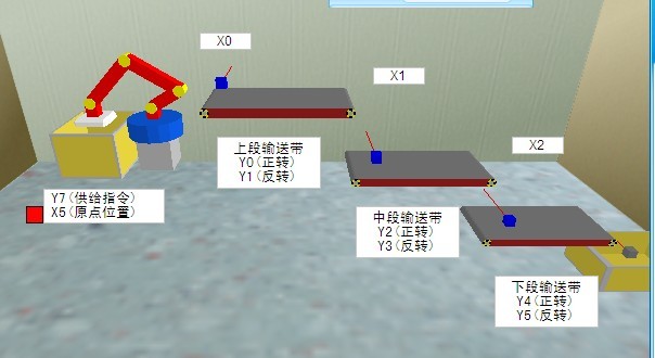 設開始時,機械臂處于原位(取產品位置),則原位檢測開關X5接通;此時,按下起動按鈕,X20接通,Y7接通并自保。機械臂將產品送至“上段輸送帶”,X0接通,Y0接通,輸送帶運轉、將產品送走(但機械臂如何放下產品,似未示出);機械臂離開原位后,X5斷開。