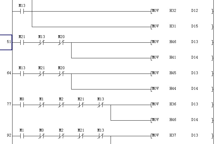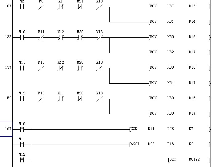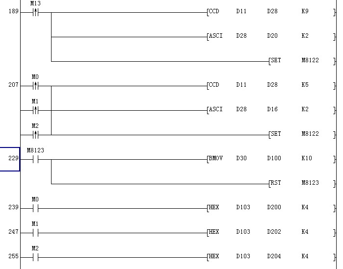 這個是三菱PLC和三菱FR-500變頻器的通信程序.這個程序的頻率寫入哪部分我看不明;頻率寫入是要把設(shè)定代碼寫到D16。D17。D18。D19。當(dāng)中;改變頻率是改變D210的數(shù)據(jù);但是我找不到哪一步程序是把D210的數(shù)據(jù)轉(zhuǎn)成ASCII碼傳到D16。D17。D18。D19當(dāng)中的啊;大家?guī)臀铱纯矗恢x了;