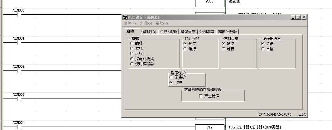 由于剛學習歐姆龍的PLC,型號是CPM1A-40CDR-A,我把編程好的新程序傳送到PLC里面,老是有錯誤,之前我對PLC改動了一下,把運行模式改為掉電前模式,現(xiàn)在就出了這個問題,現(xiàn)在老的程序也不在運行狀態(tài)了(PLC的運行指示燈不亮),把PLC斷過電之后,然后送電,這樣PLC的運行指示燈就亮了,老的程序才能運行,但我把新的程序傳到PLC里面,傳送不上去,請問各位老師是不是PLC設置哪里出問題了!請賜教!