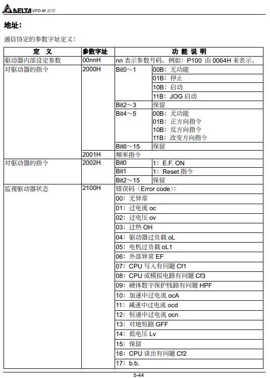 你首先要弄清楚,臺達變頻器的參數地址是以10進制表示,還是以16進制表示的。否則,你怎么寫都是不對的。就如:寫頻率地址是用2102還是用836。這些你都不懂的話怎么做通訊???????