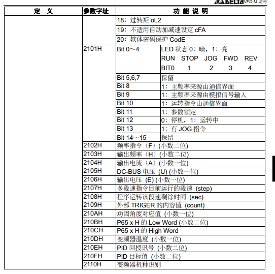 臺達的變頻器地址是16進制的,地址2000,應該2000H,將其換算成十進制后再寫入,2000的地址后面的數據從低位到高位的O 1排列好組成一個16進制的數,然后換算成10進制,寫入寄存器就好了,其中通訊時還要加入lrc校驗的數據,起始字符,呼叫類型,呼叫地址。