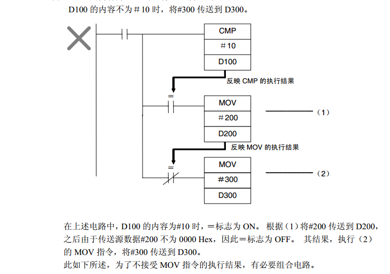 “對于 MOV 等的傳送指令,在傳送源數據為 0000 Hex 時將=標志設為 ON,不為0000 Hex 時將=標志設為 OFF。因此通過某個指令將=標志設為 ON 時,如 果立刻執行傳送指令, 則將根據傳送指令的傳送源數據是否為 0000 Hex, 而使=標志轉成 ON/OFF。”這段是歐姆龍手冊中舉得例子,問題如下: 1、對于CMP指令而言,對應的狀態標志其實P_EQ或P_NE等,查找了MOV指令并沒有找到對應的狀態標志(=),那他對應的狀態標志是什么? 2、上面一段話中說的設置,具體怎么設置呢? 3、手冊中列舉的編程的注意事項,舉到例子是用的CMP和MOV兩個前后關系造成的對應的狀態標志,手動編程實驗模擬,沒有發現什么問題,有大神遇到過嗎? 第一次發帖,求前輩大神指點。 [ 此帖被吃個鴨梨在2018-11-01 10:58重新編輯 ] |