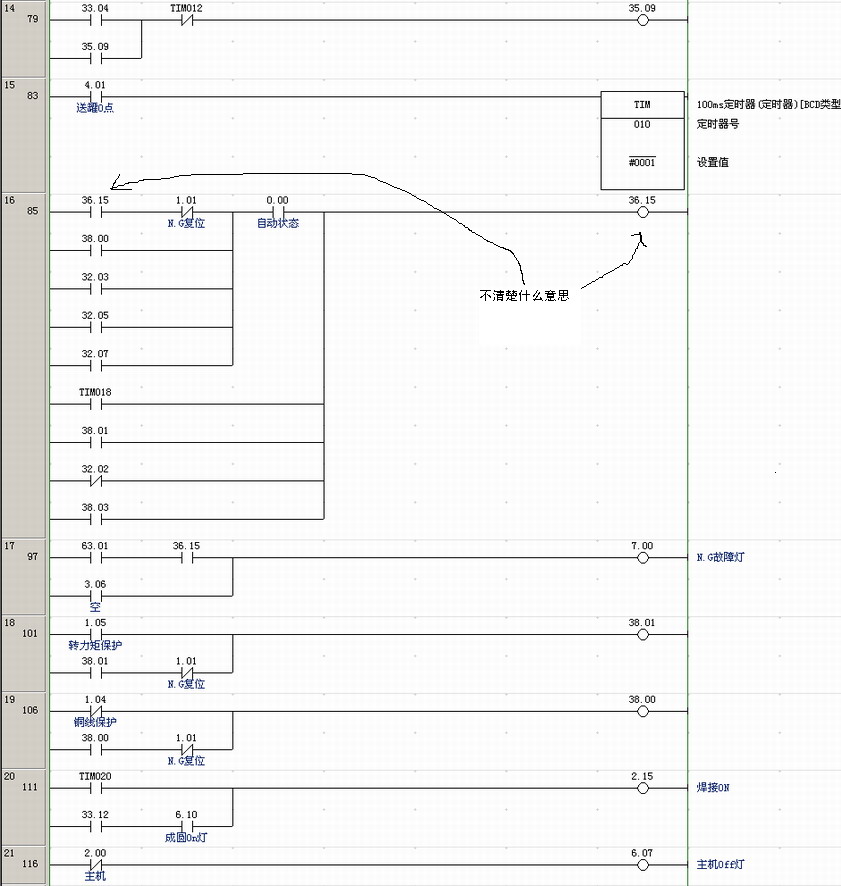 本人接觸一臺老設(shè)備用的是C120的,因?yàn)樾吞柼希由辖?jīng)常有個(gè)“頭痛腦熱”的,所有想用三菱的替換,用手編讀出來轉(zhuǎn)化為梯形圖后,一些內(nèi)部的I/O單元看不懂,不清楚是做什么用的。比如物理輸出單元式3.06,而內(nèi)部有36.15、32.11等,不知是普通輔助觸點(diǎn)還是特殊用途的,望各位老師賜教啊!