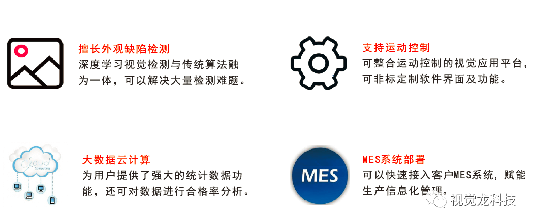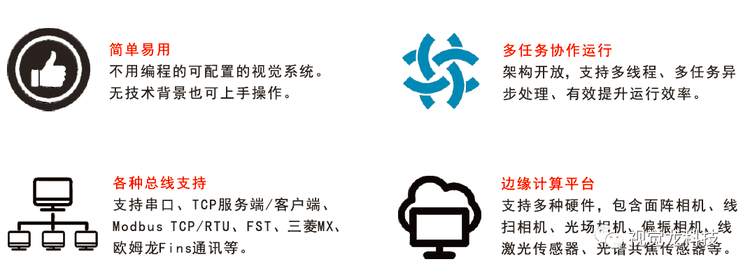 本方案采用的“龍睿AIoT”是一款低代碼、功能可視化、模塊化的視覺平臺,視覺工具拖拽式,無技術(shù)背景也可上手操作。 它包含幾千種算法,架構(gòu)開放、支持多線程多任務(wù)并行處理。龍睿擁有2D視覺、3D視覺、彩色視覺、AI深度學(xué)習(xí)視覺、視覺溯源、邊緣計算等技術(shù),可以連接各類相機(jī)和傳感器,實現(xiàn)智能制造、高端農(nóng)業(yè)、智能物流、智慧城市和智慧醫(yī)療等多領(lǐng)域應(yīng)用場景。