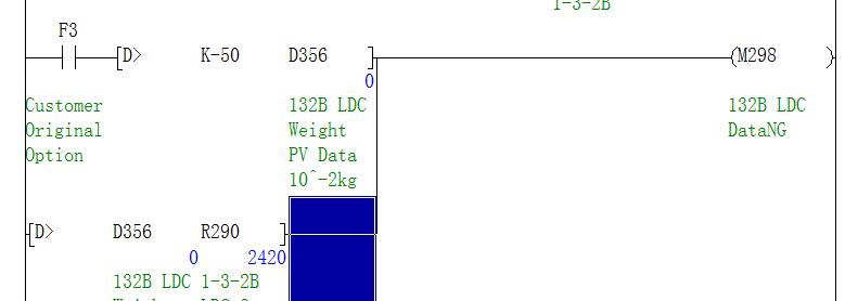 [D>=D356    R292] 是指將D356 D357與R292 R293的數據進行比較,當(D356 D357的數據)》=(R292 R293的數據)時置ON,