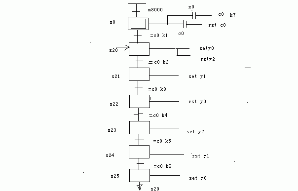 用步進(jìn)指令,同一按鈕X0,每按一次一步,為A-AB-B-BC-C-AC-A循環(huán)。圖可行嗎?Y0,Y1,Y2,分別對(duì)應(yīng)A,B,C。現(xiàn)在問題是A要多走一步如何改進(jìn)?