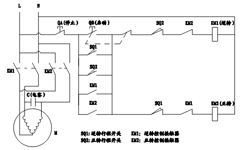 用啟動、停止開關加正、逆轉行程開關控制單相電容電動機的電路原理圖