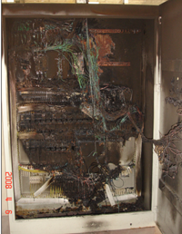2) 給客戶提供技術資料不全或在安裝調試階段對客戶的技術指導不全。從機柜的外表面來看,機柜的出線槽也有燒毀現象,并不是煙霧,另從機柜上的電弧痕跡來看,在機柜內部發生嚴重短路時外部供電并沒有及時起到保護。因為短時間的短路不會引起第一圖機柜的大面積油漆燒焦。