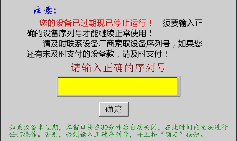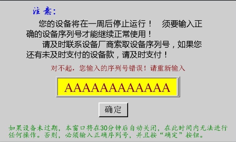 不過(guò),有點(diǎn)不明白的是:明明設(shè)定的是提前一周,進(jìn)行提示(當(dāng)然是系統(tǒng)在開機(jī)的時(shí)候進(jìn)行提示,以防在生產(chǎn)過(guò)程當(dāng)中突然停機(jī),導(dǎo)致生產(chǎn)事故。),并停機(jī)30分鐘。為什么所有客戶都是等到系統(tǒng)提示過(guò)期才給公司打電話,索取序列號(hào)并交涉支付設(shè)備款的問(wèn)題。