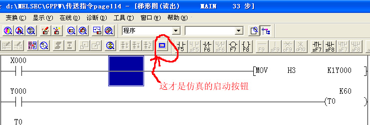 梯形圖編好后,點(diǎn)擊變換,再點(diǎn)擊"梯形圖邏輯測(cè)試啟動(dòng)"就可以測(cè)試了.