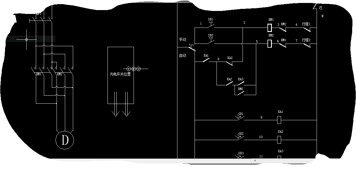 自動方式:當光1接受到信號時,KM1動作。當光1、光2接受到信號時,KM2動作。當光1、光2、光3接受到信號時,還是KM2動作。