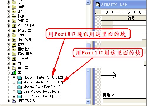 樓主,您用S7-200 CPU226CN來做MODBUS通訊主站,通過PLC的Port1口接其他的MODBUS從站設備,那么就應該用MODBUS Port1口的程序塊(下圖中的第二個項目下)。用Port0口作為電腦和PLC的PPI通訊用,這個Port0口不用設置。