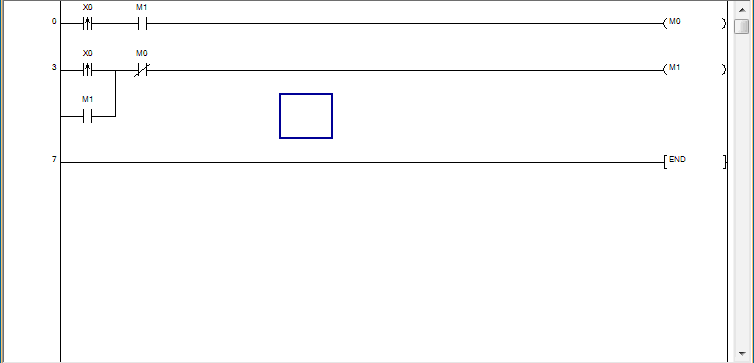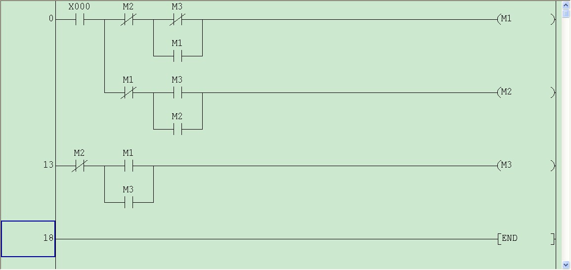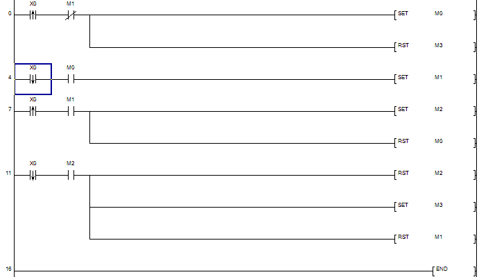上圖了,要用到上 升沿,下降沿,SET  RET,還有M0-M3都用到。這個主要要理解PLC程序處理過程,PLC是掃描工作,從上至下,從左至右的。