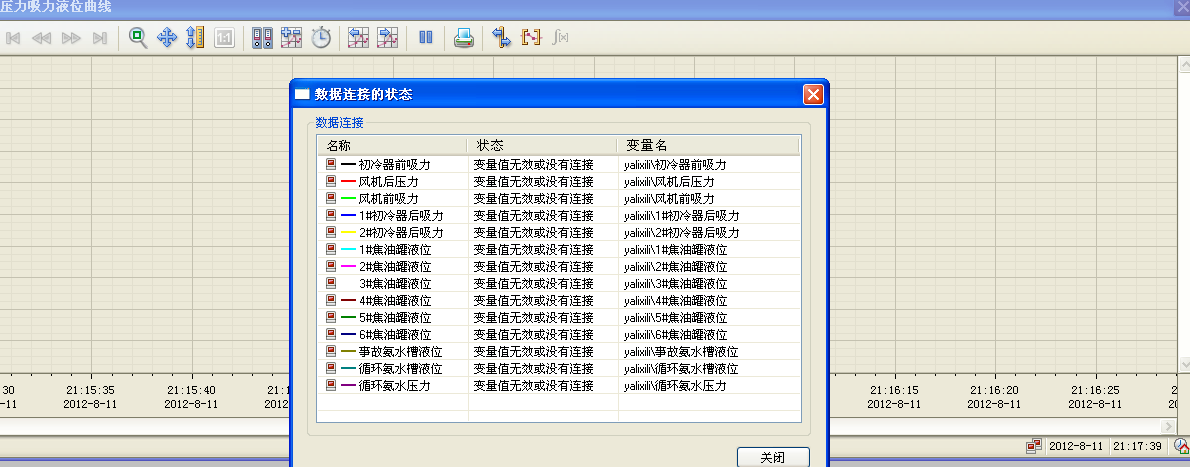 怎么會出現這種問題啊?在曲線的運行畫面上點打開數據的連接狀態提示為“變量值無效或沒有連接”,我就在運行曲線畫面的工具欄上重新連接變量,畫面上就有曲線顯示了,并且也可以查到較早前時間的曲線,一直沒弄懂,有高手能解決嗎??謝謝!!!!