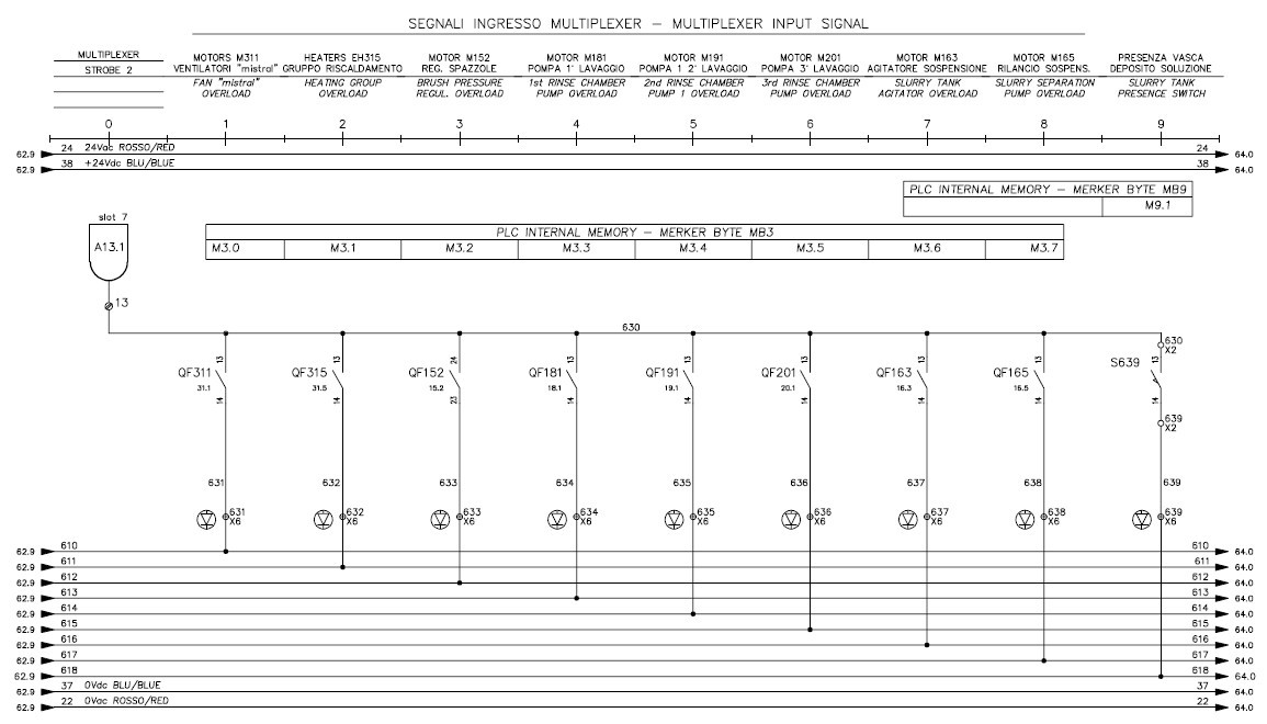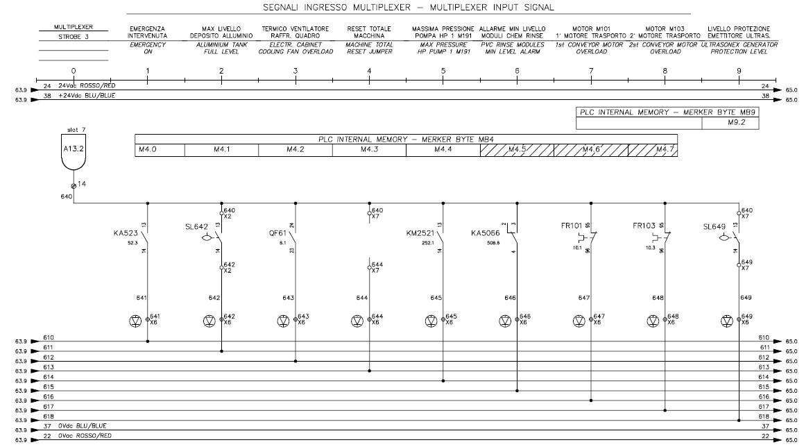 這是一個第七位(shot7)數(shù)字量輸入模塊,共有9個DI輸入接線端子?吹臅r候需從上到下看,上面英文為下面對應(yīng)DI的功能解釋。610~618為線號,24和38為電源+DC24線號,22和37為-DC24線號。A13.2為接線端子,640為來自A13.2公共端.