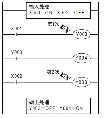 在順控程序中輸出線圈被多次驅(qū)動成為雙重輸出(雙線圈),出現(xiàn)該情況時(shí)其觸點(diǎn)狀態(tài)以程序當(dāng)前邏輯狀態(tài)為準(zhǔn)。兩個(gè)或多個(gè)線圈的狀態(tài)容易相互干擾,進(jìn)而影響編程人員對程序執(zhí)行結(jié)果的判斷。