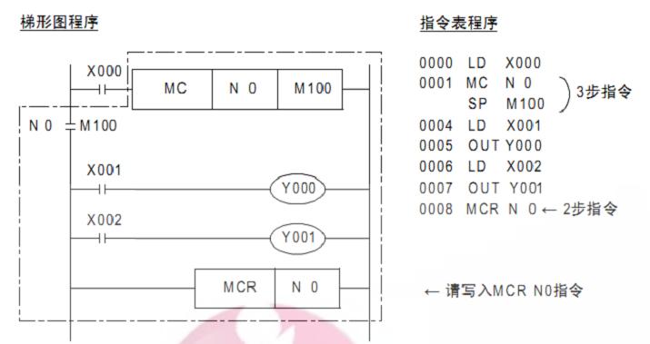 MC指令是和MCR指令成對使用的,執(zhí)行MC指令后母線會轉(zhuǎn)移到MC觸點(diǎn)內(nèi),使用MCR指令可將母線返回主線上。
