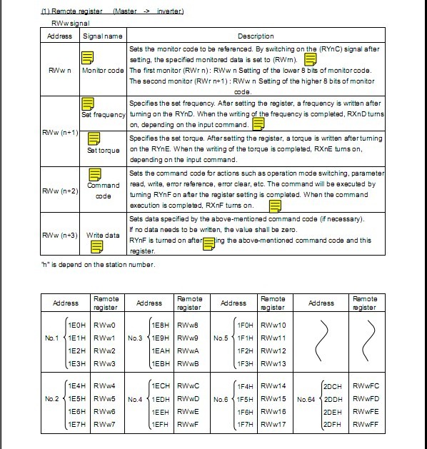 RWwn 監(jiān)視代碼,設(shè)置涉及(參考?)到的監(jiān)視代碼(對(duì)變頻器而言可以使頻率,電流,電壓以及各個(gè)參數(shù))。接通RYnC后,指定的監(jiān)視數(shù)據(jù)傳輸(設(shè)置)到RWrn。