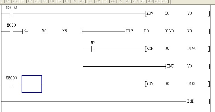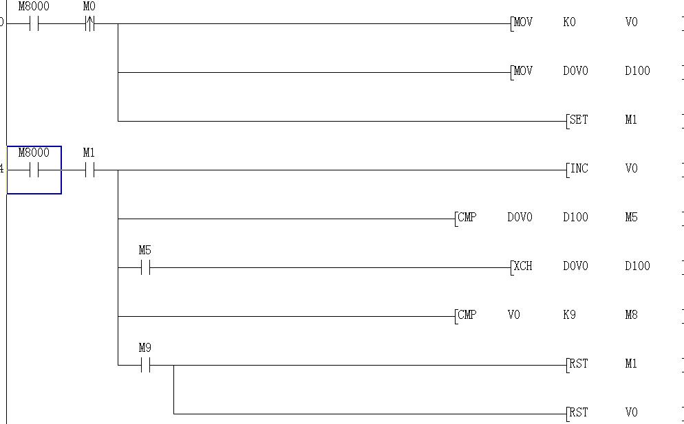 照你的程序在軟件上進行過仿真,第一次按下x0進行求最大值時可以求出最大值,接著再改變d0至d9的數值,再按x0重新求一次最大值就不行了,原因是該程序沒有對V0進行復位,所以第2次就不行了,可以在按下x0后用x0的上升沿對V0進行復位再進行求最大值