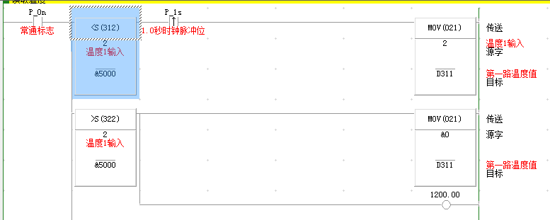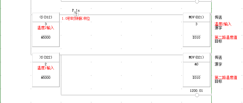 然后是進(jìn)行溫度比較:當(dāng)溫度輸入通道1、2小于100度是將將溫度輸入1、2傳送到D310、D311中。大于100度時(shí)將溫度0傳送到D310、D311.并且置為1200.00、1200.01(為什么是和100度進(jìn)行比較,我是用PT100溫度轉(zhuǎn)換器算出來(lái)的。)