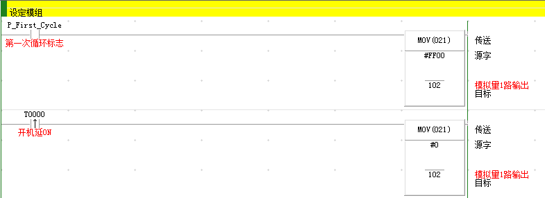 PLC運(yùn)行掃描第一周期將#FF00(0~10V的量程代碼)傳送到對(duì)應(yīng)的模擬量輸出通道102.