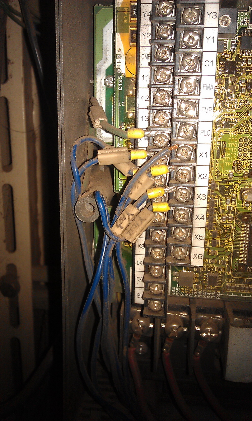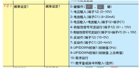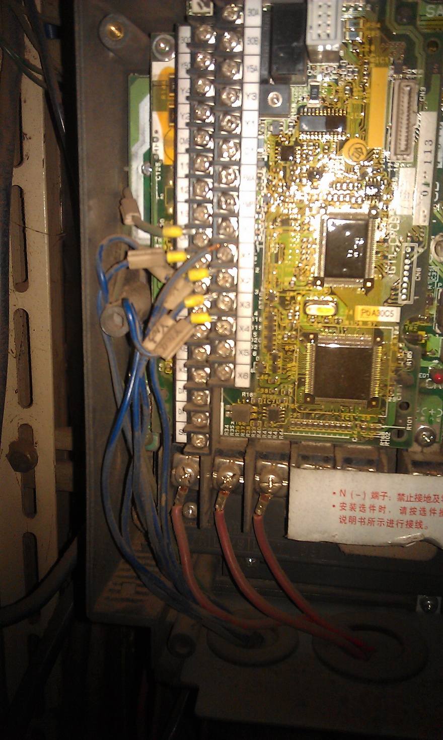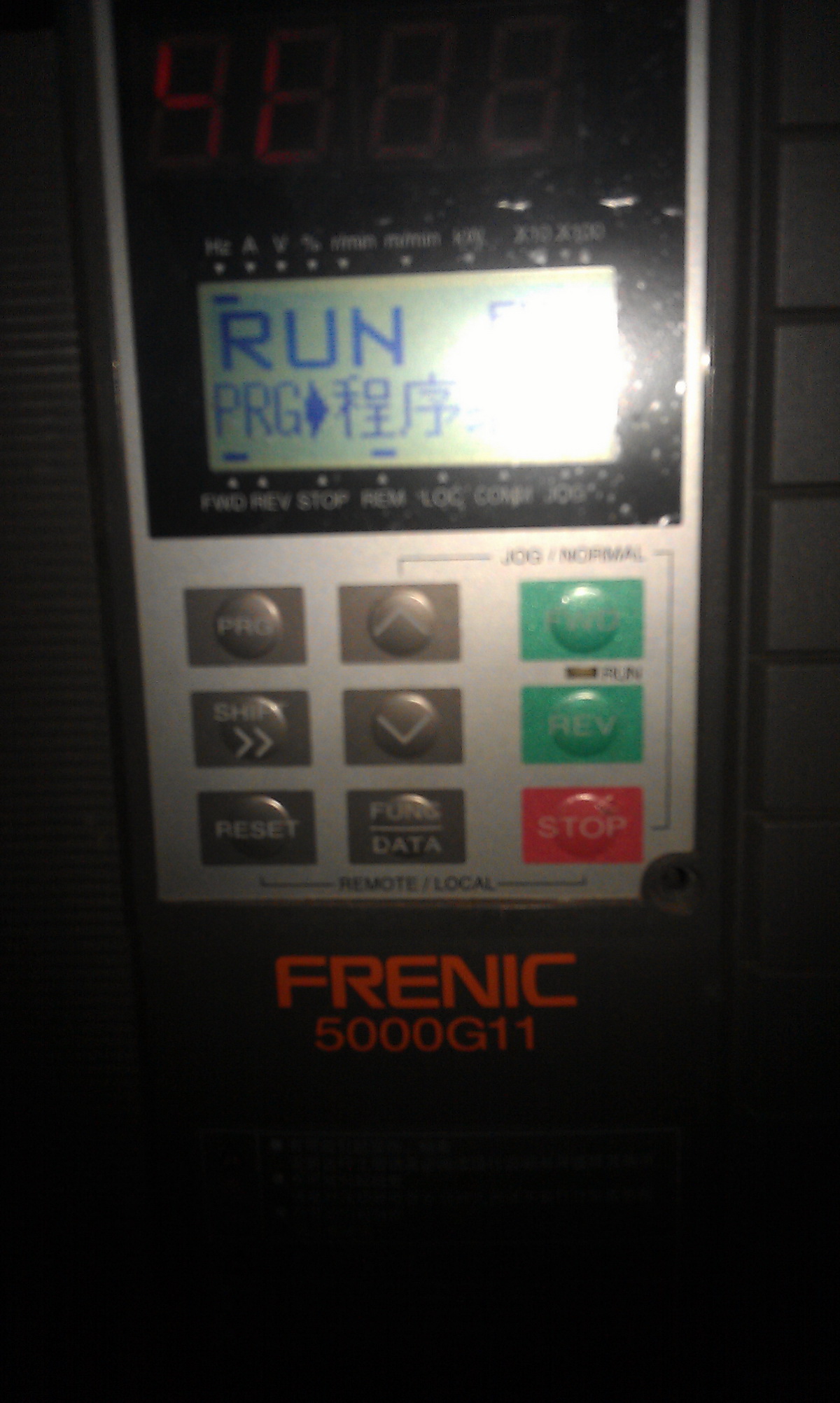 今天遇到一富士變頻器控制一條皮帶加減速,這條皮帶有高低速,可以正反轉,皮帶有15種速度,每種速度分別可調(只調一個方向的高速,低速是固定的,而且是采用按鈕加減速)。這15種速度的識別是由PLC的4個輸出點控制(初步推斷,未能查線核實),皮帶的正反轉及高低速由PLC輸出點控制,皮帶的加減速用2個按鈕控制,這2個按鈕分別接到PLC的X123與X124兩個輸入點上,變頻器的控制神就神在這里,加減速由PLC的兩個輸入點控制,但這組PLC并沒有模擬量之類的模塊,只是基本的輸入輸出模塊,這個變頻器的控制線只有7條(1條公共線,正反轉各1條,剩下的4條接在變頻器的X1、X2、X3及X4端子上),我看了一下參數設置,變頻器的頻率信號給定方式設置是“0”