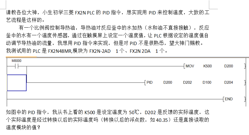 3、FX2N-2AD采集的溫度值是整數形式的數據,需要計算轉換成實數形式的溫度值。轉換計算公式取決于所用的溫度傳感器。實數形式的溫度值再乘以10,最后轉換成整數值,作為PID指令需要的測定值。