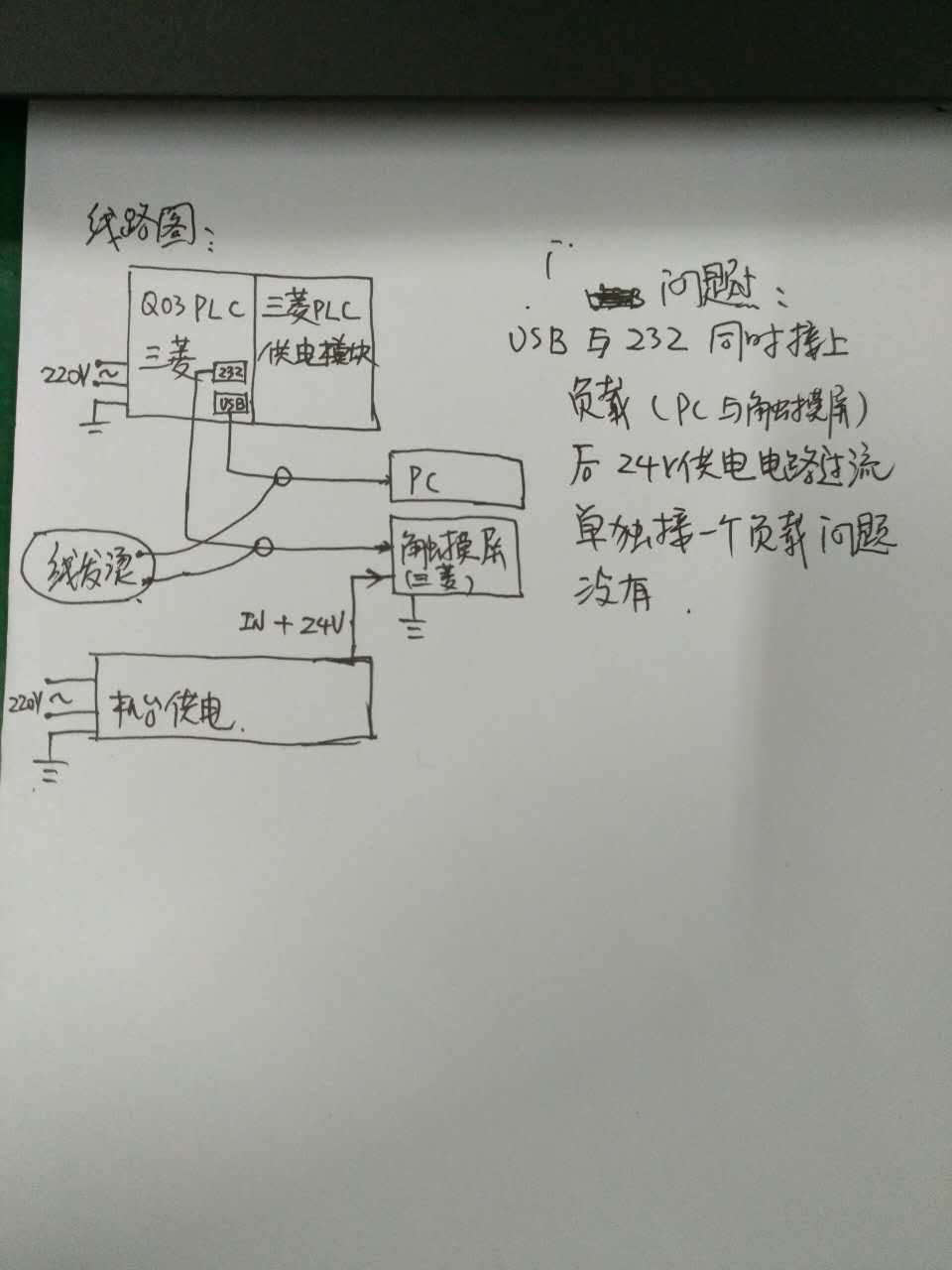 Q03UPLC通過RS232線與觸摸屏連接和通過USB與PC連接后發生RS232線、USB線發熱引起24伏電壓過流