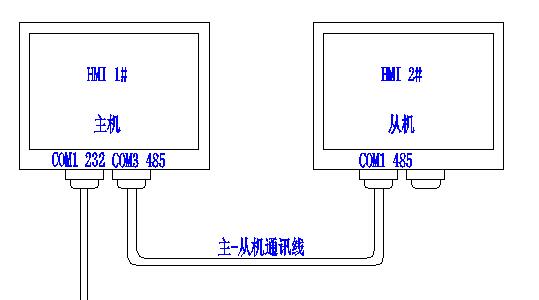 補充樓上的,如果不帶以太網口,通過232做主從屏。一般觸摸屏后面會有至少兩個串口的,主屏與PLC占用一個,可以通過另外一個與從屏端口通訊。方案如下圖: